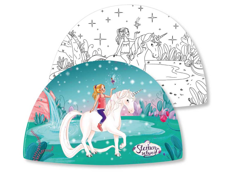 Set besteht aus 8 Papier-Platzsets (38cm x 27cm)Vorderseite im Sternenschweif DesignRückseite zum Ausmalen