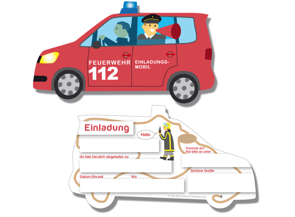 Set bestehend aus 6 Einladungskarten in Form eines Feuerwehrautos (18x10cm), beidseitig bedruckt, im PE Beut el mit Kopfkarte.