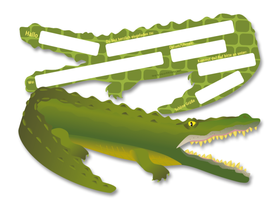 Set bestehend aus 6 Einladungskarten in Krokodilform (21x10cm), beidseitig bedruckt, im PE Beutel mit Kopfkarte.